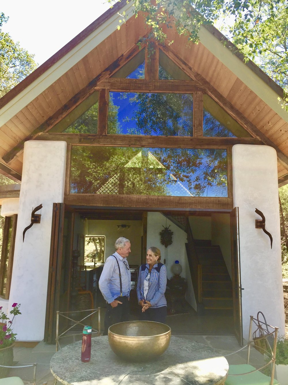 Lillian “Lilibet” Clarke visits the hempcrete cabin of Clark Anderson (L) in Hopland, CA. Photo courtesy of Lillian Clarke