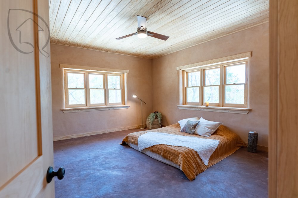 This particular design, paired with small windows both helps the energy efficiency of the home and brings occupants out of the building so they spend more time connected with outdoor spaces. With grade beams instead of slabs, full adobe floors in the entire home including the breezeway, and natural monolithic cellulose-based wall cavities (hemp, in this case) we address the issues of sustainability the modern building industry struggles with.