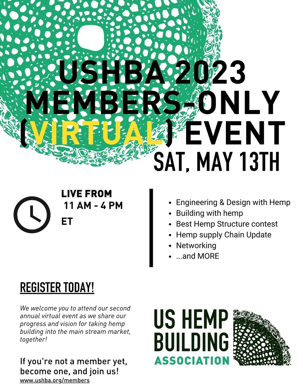 US Hemp Building Association will host an online Members Only event May 13.