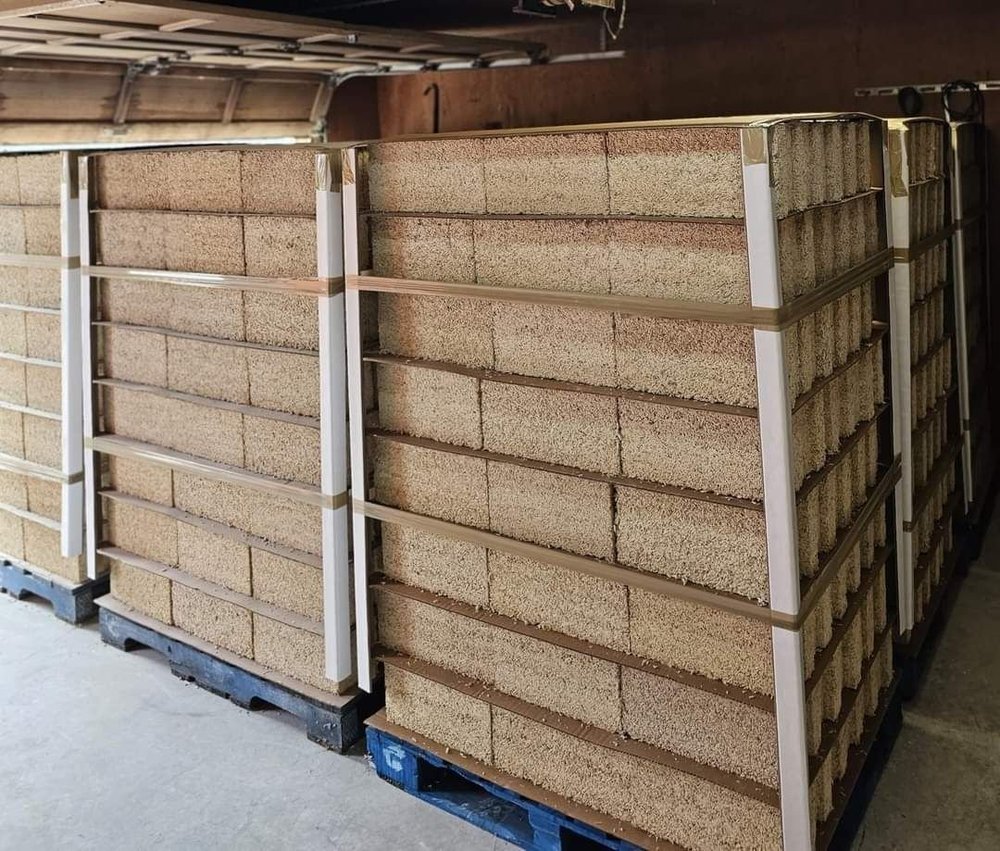 Just a few of the hempcrete block pallets from Divita Blocks. Thirteen pallets will be making their way from Alberta to Nebraska for installation. Photo courtesy of Tina Jones