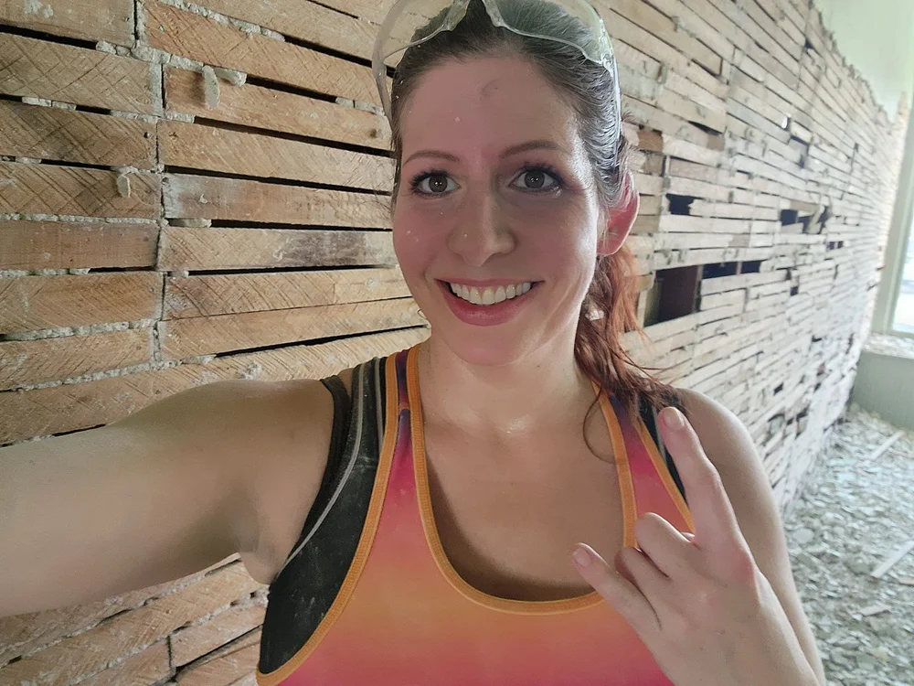 Tina Jones of Denton, NE-based General Hemp Construction poses with the exposed laths after wall demolition in the historic 1911 General Store she’s renovating with hempcrete blocks. Photo courtesy of Tina Jones