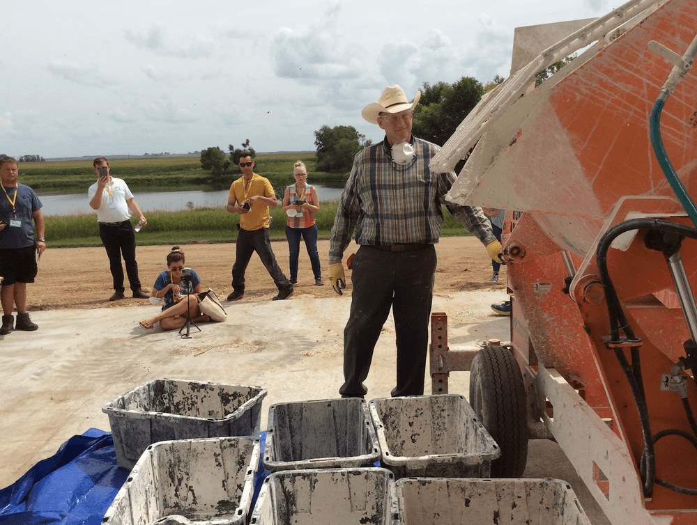 Hemp builder Ray Kaderli, president of the US Hemp Building Association, prepares to empty a mixer of hempcrete into buckets to build a sample wall at Complete Hemp Processing Winfred, SD. Photo by Jean Lotus