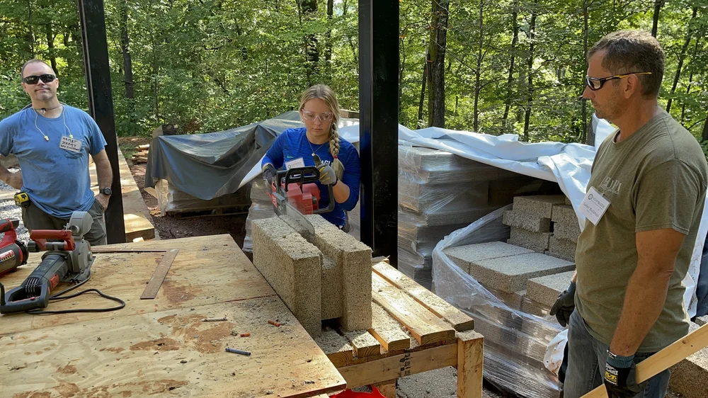 Crystal Cervantez-Tkac, (center) cuts a hempcrete block with a chainsaw at the HempBLOCK USA master builder workshop in Wildwood, GA. Photo courtesy of Crystal Cervantez-Tkac