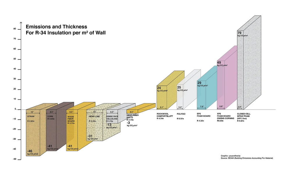 At a recent conference, the brilliant Mae-ling Lokko, in a talk about biogenic materials called insulation “the low-hanging fruit.” While many material researchers are working to develop more complex applications for bio-based materials, I want to spend the next few minutes to lay out why this underappreciated and often overlooked building element, is not only a low-hanging fruit. Paying closer attention to the material choices we make for insulation has an outsized impact on emissions reduction and planet health.